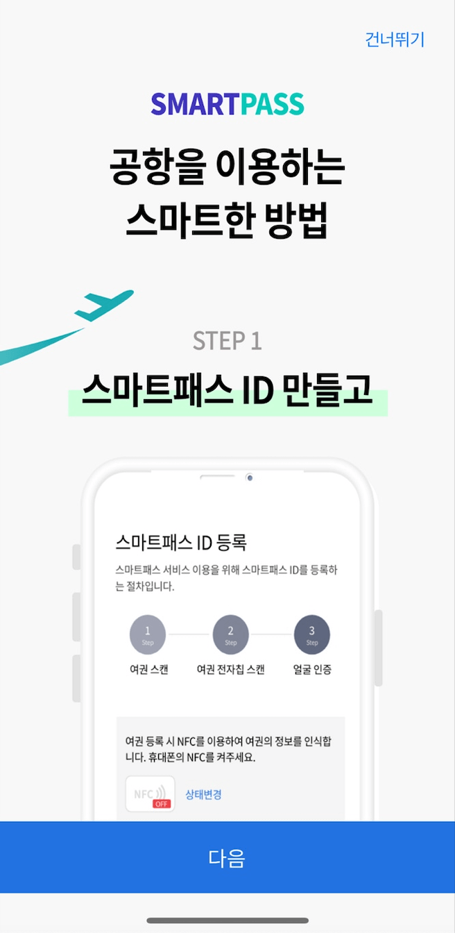 인천공항 스마트패스(SMART PASS)의 등록 방법은 모바일 앱에서 여권 첫 장 사진을 찍으시고 여권 전자칩 사진 찍으신 후 얼굴 사진까지 등록하시면 등록은 간단하게 끝납니다. 등록은 만 7세부터 가능하고 한 번 등록하시면 5년동안 이용 가능합니다.